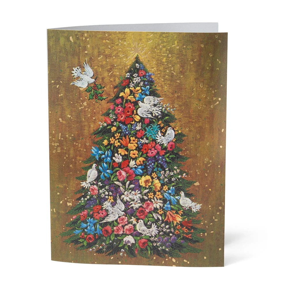 A holiday tree in full flower with perching doves sends a garden of greetings in this radiant 1966 painting by American illustrators Carl Tait (1917–2011) and Lloyd Henson (n.d.).