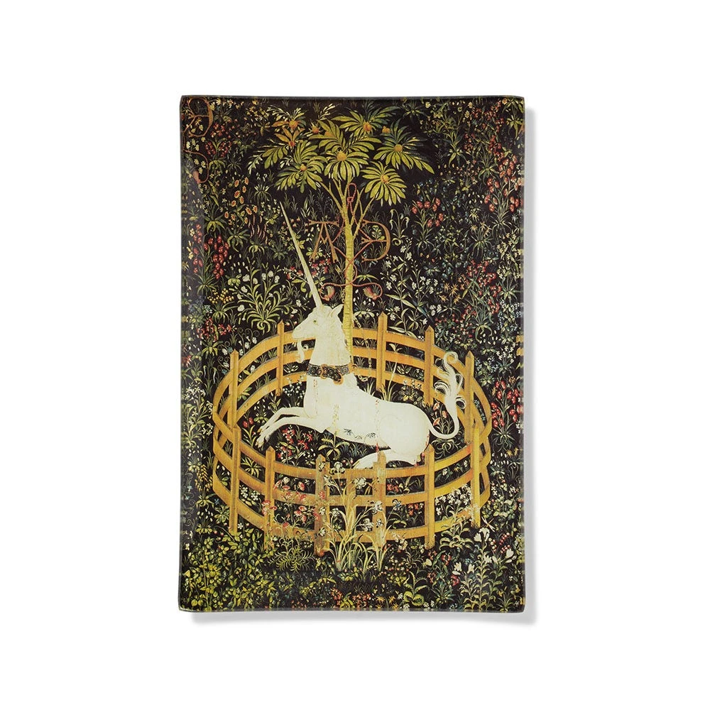 The Unicorn Rests in a Gardenย (1495โ1505) is an iconic French and South Netherlandish textile belonging to the famous Unicorn Tapestries at The Met Cloisters. This beloved medieval masterwork, featured on this artful glass catchall tray, depicts a unicorn resting in a garden enclosure beneath a pomegranate tree, enveloped by a millefleurs backdrop of richly symbolic plants.