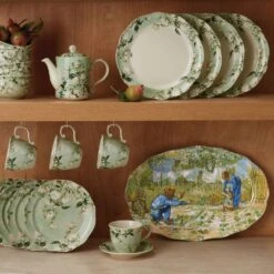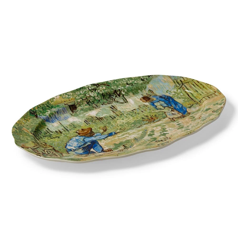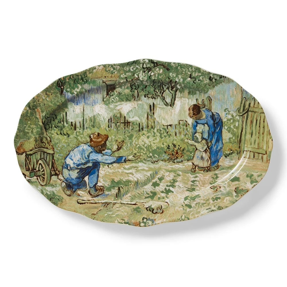 This platter showcases a joyous detail from First Steps, after Millet (1890), one of Vincent van Gogh’s (Dutch, 1853–1890) many interpretations of works by Jean-François Millet (French, 1814–1875). Van Gogh deeply admired the Barbizon School cofounder, who so adeptly portrayed the beauty and drudgery of rural French life. In the fall and winter of 1889–90, while he was a voluntary patient at the asylum in Saint-Rémy, the Dutch artist painted 21 copies—or “translations,” as he referred to them—after Millet, including this endearing picture of a young child toddling toward a field-bound figure with open arms.