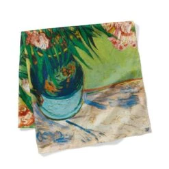 The pink petals defining the joyous bouquet on our oversize square silk scarf are that of oleanders, which Vincent van Gogh (Dutch, 1853–1890) regarded as life-affirming flowers for the way they bloomed “inexhaustibly.” In this vibrant still life from August 1888, the artist immortalized an arrangement of oleanders in a majolica jug, which also appears in other still lifes made during his time in Arles. Nearby, Van Gogh has symbolically depicted a copy of Emile Zola’s novel La joie de vivre.
