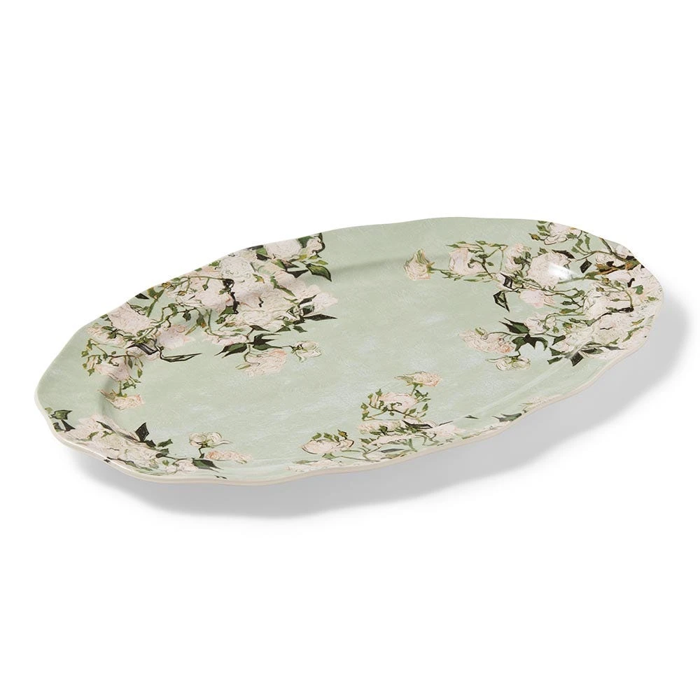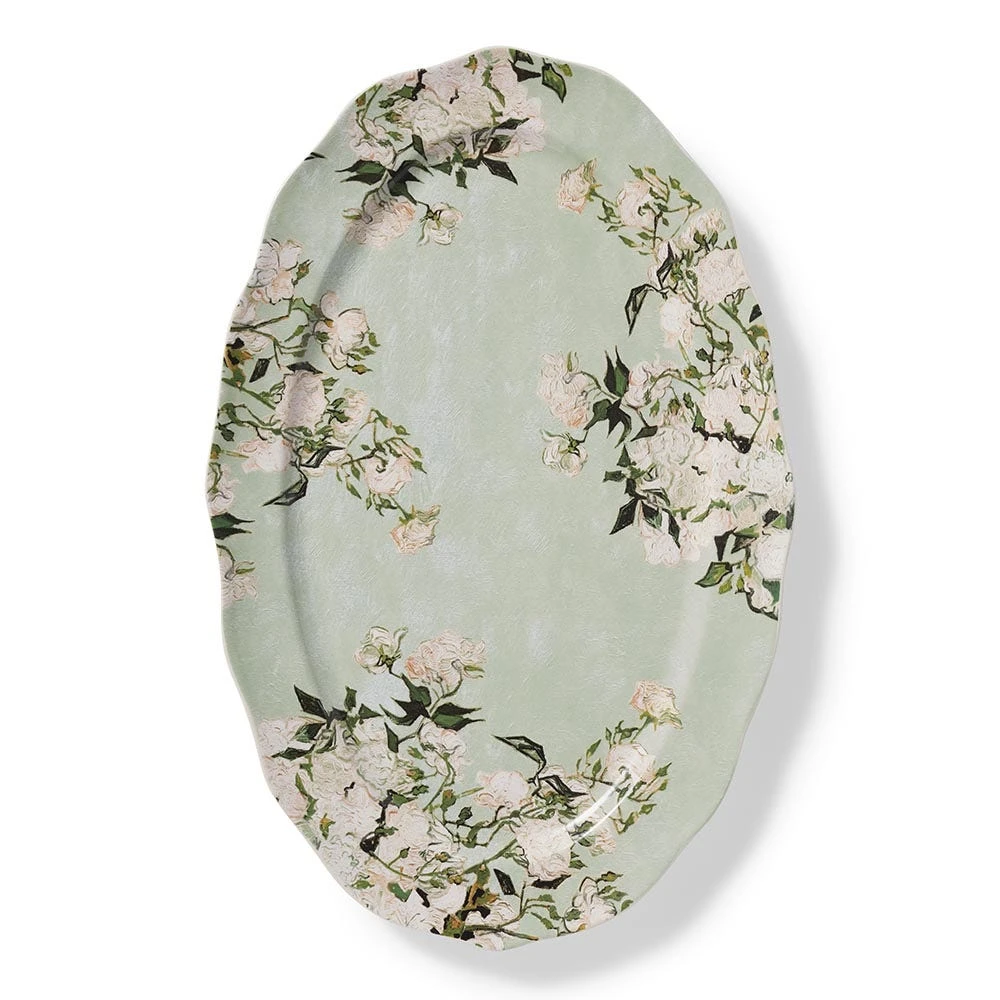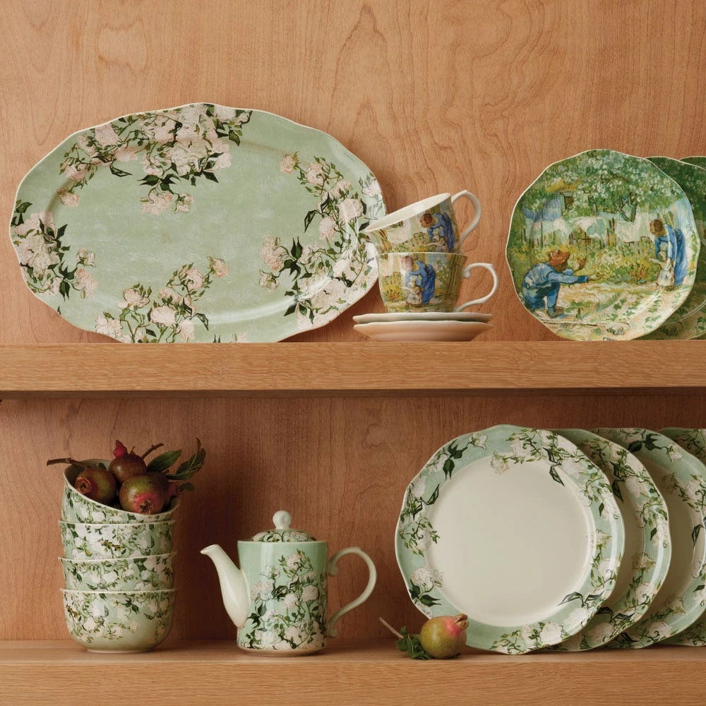 Serve up springtime with our pretty platter featuring a detail from one of Vincent van Gogh’s (Dutch, 1853–1890) celebrated bouquets. In May of 1890, on the eve of his departure from the asylum in Saint-Rémy, the Dutch artist painted four exceptional still lifes, including the tranquil Roses (1890) in The Met collection. Though the color has since faded, traces of pink nestled in the blooms and along the tabletop hint at the vividness of the artist’s “canvas of pink roses against a yellow-green background in a green vase” in its original state.