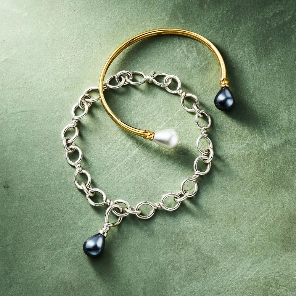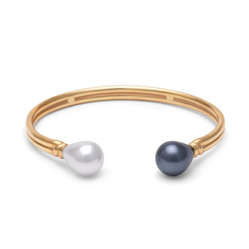 Our chic Venus Pearl Cuff features alluringly mismatched black and white glass pearls and 18K gold-plated brass. It adds a Baroque accent to an everyday work outfit, or a stands out on a special occasion. The lustrous black glass pearl varies in luminosity and will appear different depending on the light. Classic yet functional, this cuff will be a staple of your wardrobe for years.