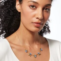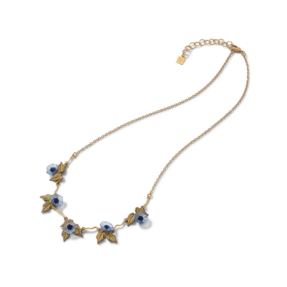 The blue cast-glass blooms adorning this necklace reinterpret William Morris’s (British, 1834–1896) Kennet (registered in 1883 and printed around 1917–23), a block-printed textile in The Met collection. This mesmerizing motif references rich 15th- and 16th-century Italian velvet designs as well as Art Nouveau, which would come to be defined by “whiplash” curves and sinuous lines. Though Morris frequently looked to the arts and crafts of the past, he was likewise a forerunner of modern design.