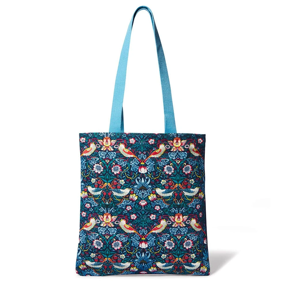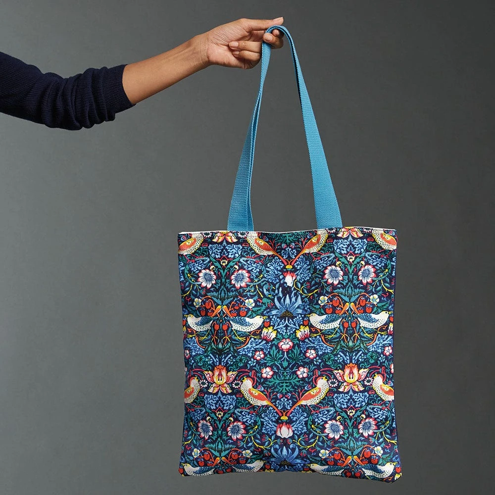 William Morris’s (British, 1834–1896) whimsical Strawberry Thief features on our delightful canvas tote bag. Registered in 1883 and printed between 1917 and 1923 at Merton Abbey Tapestry Works near Wimbledon, the beloved botanical motif was derived from Morris’s country home, Kelmscott Manor, where a community of thrushes would relentlessly pluck the strawberries from his garden.
